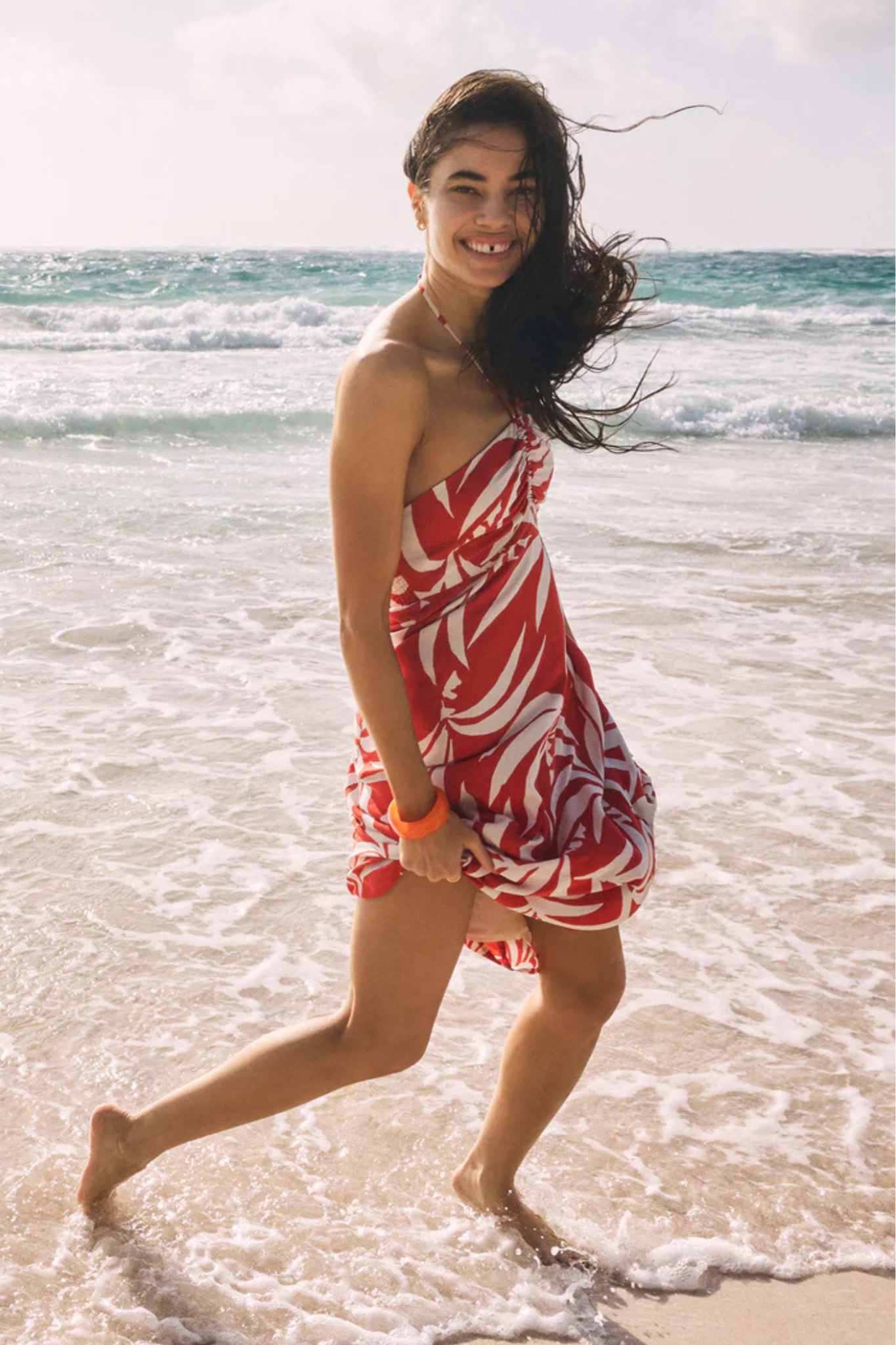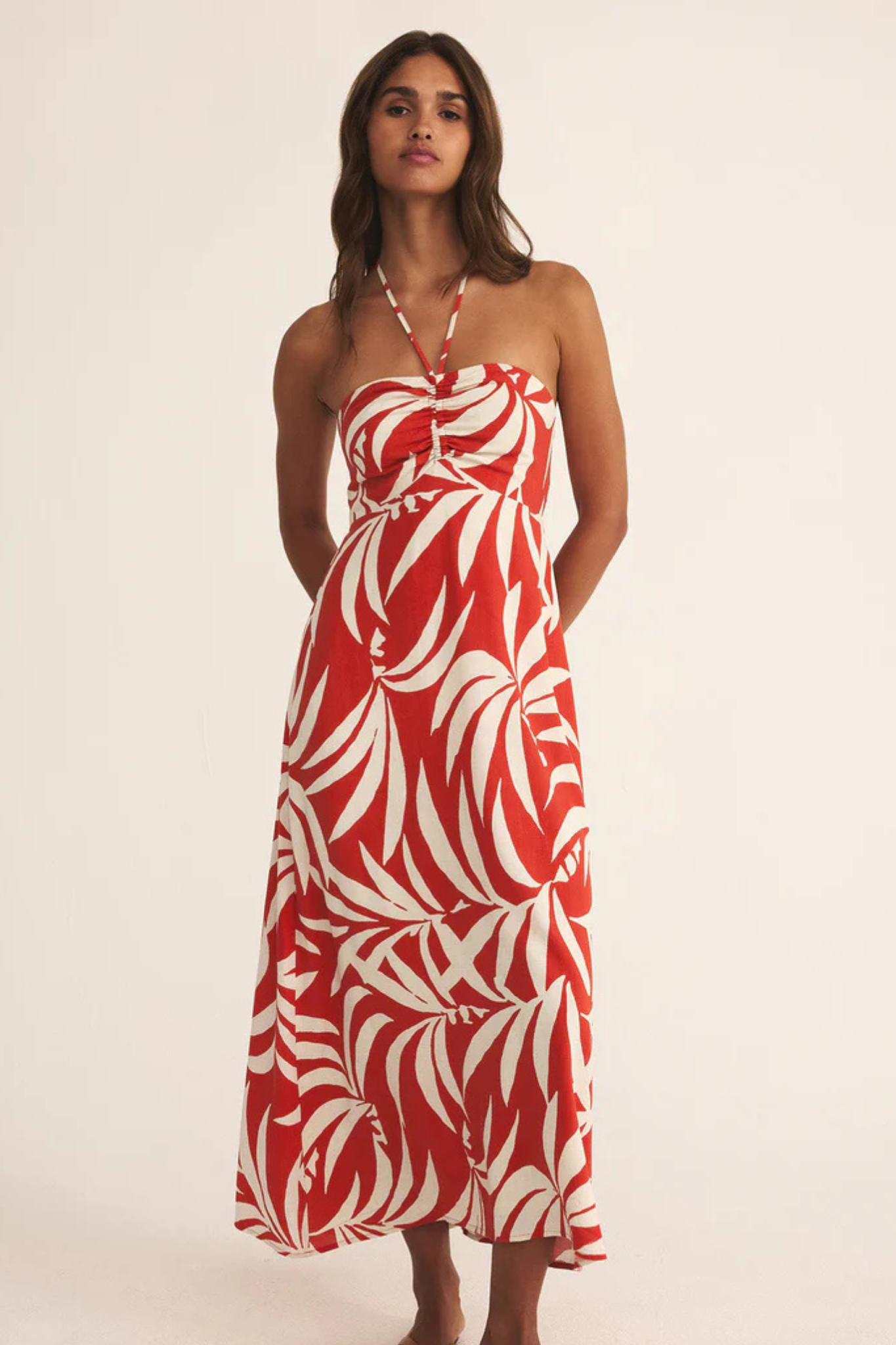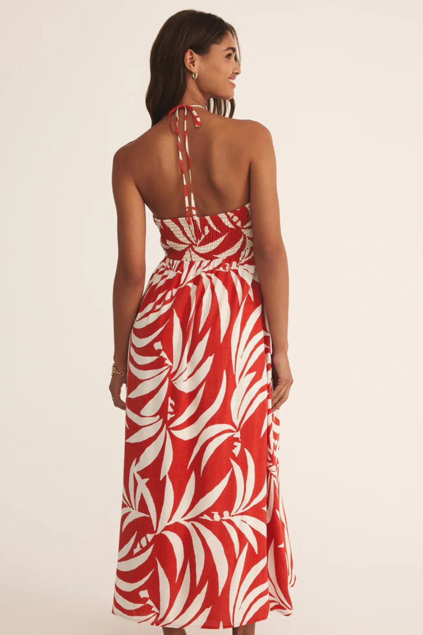 Sun-drenched days call for this tropical-print bandeau halter dress, complete with a center tie and a smocked back for the perfect fit. With a body-skimming silhouette, halter straps, and silicone gripper tape for extra support, it’s made for soaking up the sun in style.