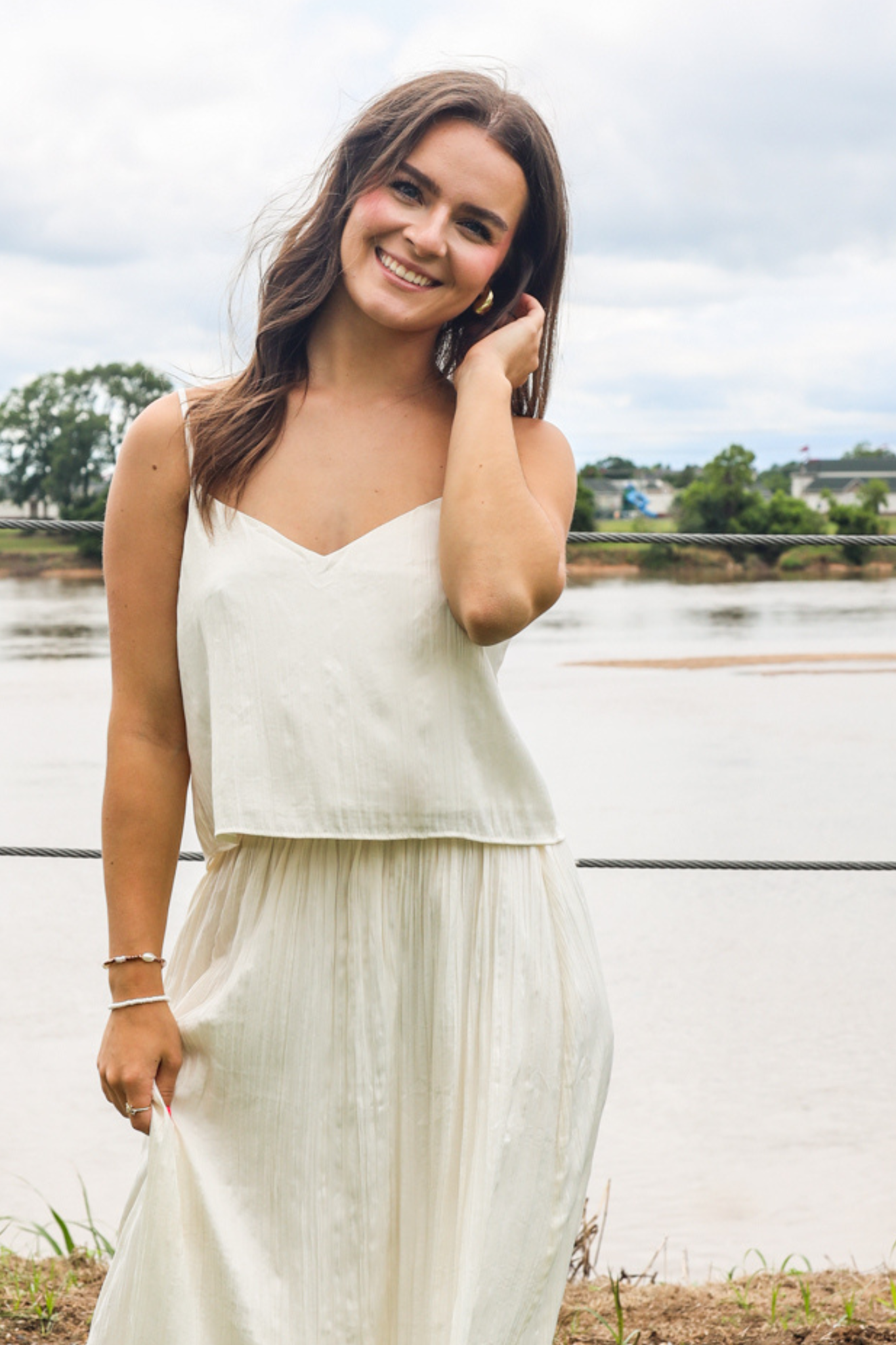 Chic with a touch of texture, this satin tank is the definition of effortless dressing. With a flattering v-neck and crinkled finish, it’s an easy pick for day or night. Style with the matching skirt or pair with your favorite denim shorts.